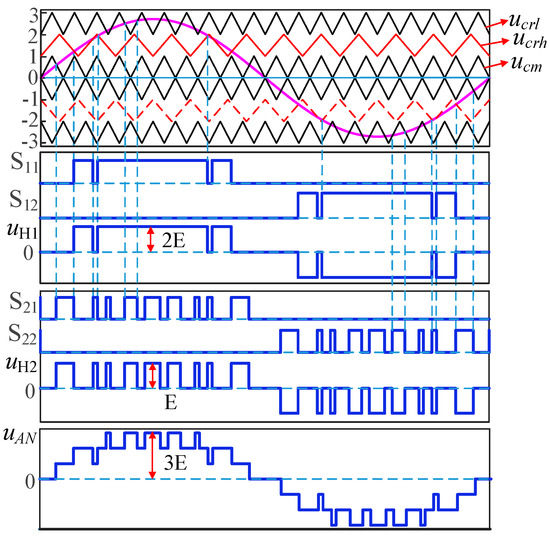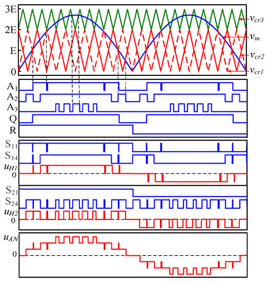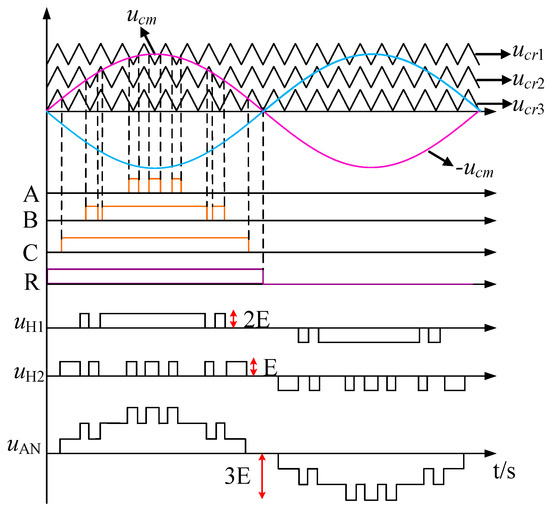 The modulation diagram of the unipolar LS-PWM method proposed in literature [17] is shown in Figure 6. The reference sinusoidal signal ucm is compared with three triangular carriers ucr1, ucr2, and ucr3, which are located above the zero reference line and arranged continuously from top to bottom, to obtain three logical pulse signals A, B, C. At the same time, the reference sinusoidal signal −ucm, which is opposite to ucm, is compared with triangular carriers ucr1, ucr2, and ucr3, to get A’, B’, C’. The polar signal R of the modulated wave is obtained by comparing the signal ucm directly with the zero reference voltage. R is always high in the positive half period of the modulated wave and zero in the negative half period. Because of the unipolar modulation characteristic of this method, the driving signals of left-arm switches S11, S12, S21, and S22 are determined by polar signals R, while the driving signals of the other switches are determined by R and six other logical pulse signals.
