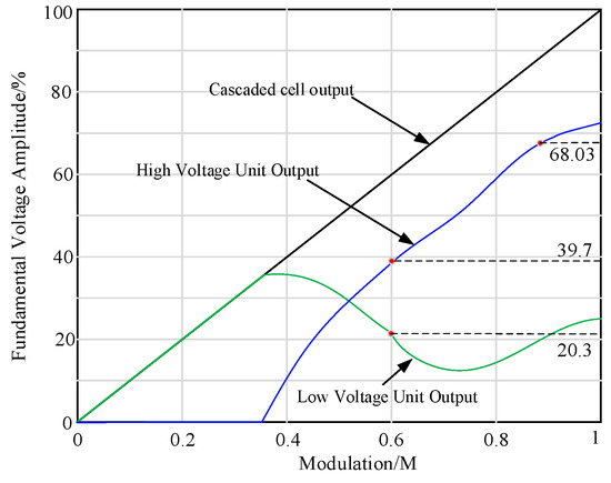 The relationship between the fundamental amplitude of three voltages and the modulation M is shown in Figure 7. It can be seen that the polarity of the output fundamental wave voltage of the high voltage unit and the output fundamental wave voltage of the low voltage unit are always positive in the whole modulation ratio range. Therefore, when utilizing unipolar LS-PWM modulation, there is no power back-filling problem in the whole modulation ratio range.