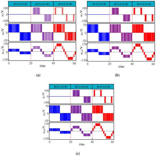 The output characteristics of hybrid cascaded H-bridge inverters with modulation index of 0.3, 0.6, and 0.9 are shown in Figure 10a–c, respectively, under hybrid frequency modulation strategy, unipolar LS-PWM modulation strategy and double frequency modulation strategy based on LS-PWM.