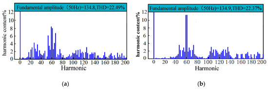 From Figure 14a, it can be concluded that the frequency doubling modulation strategy based on LS-PWM can effectively solve the current inversion problem of type II ACHB inverters. When the carrier frequency is changed to 3 KHz, the THD value of the output voltage is larger than that of the carrier frequency of 5 KHz, but the main harmonics are also near the carrier frequency.