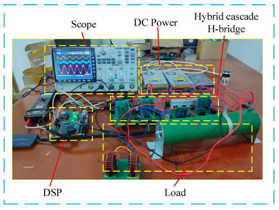 In order to verify the effect of the proposed control method, a hybrid seven-level experimental platform is established, which is controlled by DSP, and the experimental setup is presented in Figure 12. Experiments are carried out at the same carrier frequency with different modulation indexes and different carrier frequencies with the same modulation indexes. The main parameters of the system are shown in Table 3.