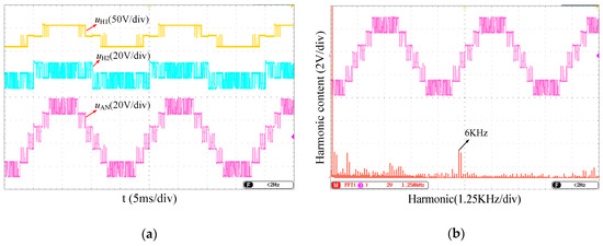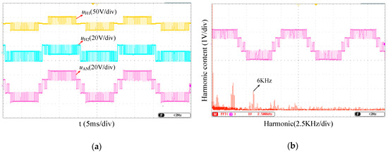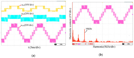 It can be seen from Figure 15a,b that the frequency doubling modulation strategy based on LS-PWM can still effectively solve the current inversion problem of type II ACHB inverters at low modulation index, but the output phase voltage is only 5 levels. It can be seen from Figure 15b that the harmonic of the output phase voltage uAN is mainly near the carrier, so high quality waveform can be obtained under this modulation method.