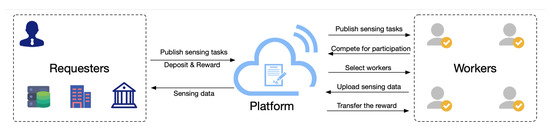 Although crowdsensing ideally enhances the efficiency and convenience of data aggregation, there are two significant problems that remain to be solved [11,12]. First, the typical crowdsensing system is mostly managed and maintained by a centralized platform. As shown in Figure 1, the centralized platform which connects the requesters and workers is a key component of the system. However, the centralized system may suffer from the single point of failure [13,14]. Once the central platform is compromised, the sensitive and private data will be at risk of leakage.