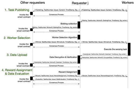 The overall system flow is shown in Figure 3 and is divided into three parts: initialization, task process, and system synchronization. In the part of initialization, the necessary configuration and identity authentication mechanisms will be presented. In the part of task process, we will introduce the specific steps of crowdsensing. In the part of system synchronization, we will discuss and analyze the issue of data and state synchronization.