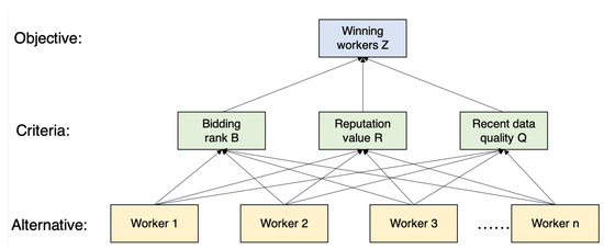 where and . Setting the weighted value directly is difficult for a requester, and an inexperienced requester may not be able to select optimal workers due to an incorrect weight setting. Therefore, in order to balance the sensing cost and data quality, we use the AHP method to calculate , , and . The specific framework is as shown in Figure 4.