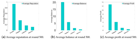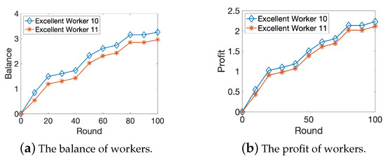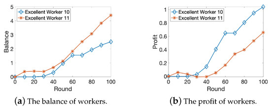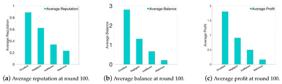 We compare the average reputation, balance, and profit of different groups. As shown in Figure 5a and Figure 6a, we note that the workers’ reputation will be enhanced as they become more truthful and reliable. The reputation of the excellent workers will gradually increase. They will be more likely to be selected as winning workers and obtain more profits, as shown in Figure 5c and Figure 6c. On the other hand, the reputation of malicious workers will gradually decrease and the workers will be isolated and obtain zero profit ultimately. Figure 5b shows that the negligent and indifferent workers have chances to perform sensing tasks at the early stage. However, since they sometimes upload false data, after a while, the requesters will prefer excellent workers, as shown in Figure 6b. This demonstrates that more excellent workers will be selected as the winning workers to perform the sensing task, which will help improve the overall data quality obtained by the requester.