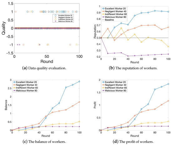 We mainly test the results of workers’ reputation value, balance, and profit to verify the effectiveness of our incentive model. In order to compare the credibility and benefit of workers with different behavioral characteristics, we divide all workers into four groups: