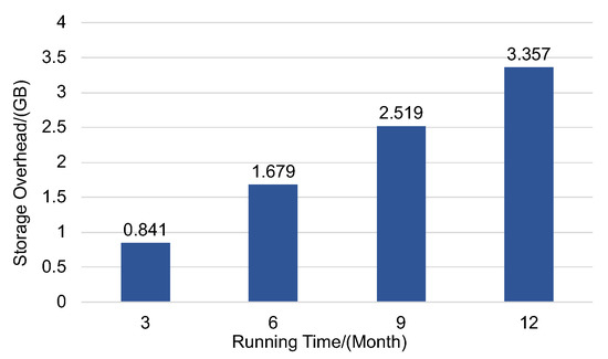 We will discuss the storage overhead of blockchain data in this part. A block header is about 80 bytes [17]. The data in the block consists of two parts: (about 150 bytes) and the task related transaction (about 150 ∼ 200 bytes) such as , , etc. The frequency of block generation will be settled within 1 min. The storage overhead of block head and task related transaction in one block is bytes, where m is the number of transactions in the block. Therefore, the storage overhead of the whole blockchain is about bytes. The detailed storage overhead of blockchain is shown in Figure 10. The result has demonstrated that the storage cost of synchronizing blockchain is affordable to requesters. The effective method for lightening the storage burden will be considered as our future work.