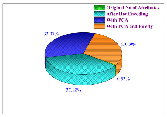 The original dataset had 43 attributes. After One-Hot encoding technique is applied, number of attributes were enhanced to 3024. After applying PCA, number of attributes have been reduced to 2694. The attributes are further reduced to 2386 with the application of the hybrid firefly algorithm. Figure 3 shows the number of attributes for all these models.