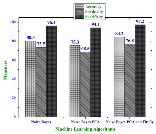 In case of naive Bayes based approach as shown in Figure 5, it is observed that for all the metrics (specificity, sensitivity and accuracy), the combination of Naive-Bayes-PCA-firefly algorithm yields higher value than the Naive-Bayes-PCA (accuracy—75.3%, sensitivity—68.5% and specificity—94.1%) and classical naive Bayes algorithm (accuracy—80.3%, sensitivity—73.5% and specificity—96.1%) with sensitivity value of 76.8%, specificity value of 97.2% and accuracy value of 84.2%.