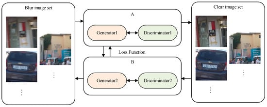 In order to eliminate the difference between the real blurred image and the blurred image synthesized by the algorithm, as well as to achieve a better image deblurring effect in the real industrial scene, we used the CycleGAN structure [] on the premise of having an unpaired dataset. An image deblurring model based on a generative adversarial network was established. The overall structure of the model is shown in Figure 1. This model consists of two generative adversarial networks A and B, which are used to achieve the conversion from blurred images to clear images and from clear images to blurred images. A and B networks are composed of their respective generators and discriminators. The model also adds a loss function to the network that combines adversarial loss and perceptual loss. Such a model just constitutes a cyclic structure consisting of clear-> blur-> clear and blur-> clear-> blur, which better constrains the content of the generated sample. This article will introduce each part of the model separately.