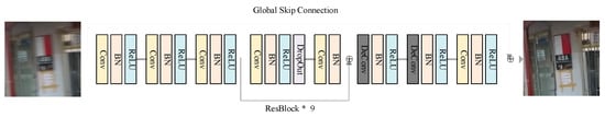 In generative adversarial networks, generative networks are the key. In previous studies, some classic network structures [,] have also achieved outstanding results. Among them, the deep residual network structure has achieved better performance in generating high-definition image tasks because it can greatly increase the number of layers in the network, as shown in [,]. The deep residual network was proposed by He et al. [] in 2016. It is composed of several residual block (ResBlock) and other layers. After using the residual module, the number of layers of the network can be greatly deepened without the phenomenon of difficult model convergence, model degradation, and disappearance of gradients. Therefore, we used the deep residual network structure as the network structure of the generator. In addition, we added global skip connection [] to the generative network. Global skip connection can directly connect the input of the entire network to the output. Therefore, the intermediate network only learns the residual between the output and the input, thereby reducing the amount of network learning and making the network converge faster and fit to improve the generalization ability of the model.