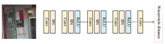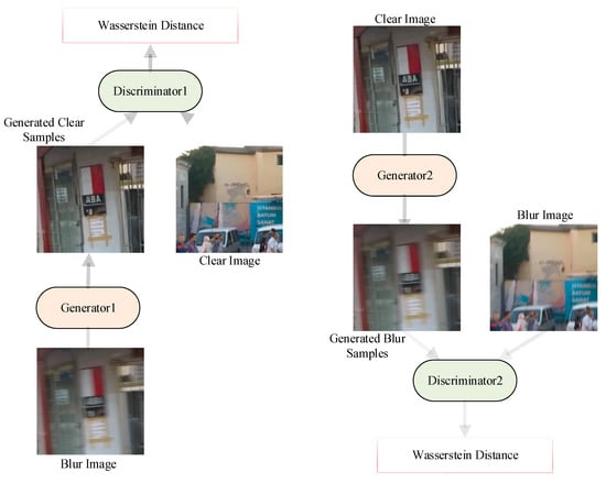 Adversarial loss refers to the loss function between two generative adversarial networks A and B. For A, its role is to make the generated image as realistic and clear as possible, and for B, its role is to make the generated sample have as realistic motion blur as possible. In the development of generative adversarial networks, various adversarial loss functions have appeared, including cross-entropy loss functions [], squared loss functions [], and Wasserstein distance loss functions []. Because WGAN-GP [,] uses the Wasserstein distance loss function as the adversarial loss of the network and increases the gradient penalty term for discriminating the network, it has achieved the most stable training effect at present. Therefore, we used the Wasserstein distance loss function for the confrontation loss. The calculation process of the adversarial loss is shown in Figure 4.