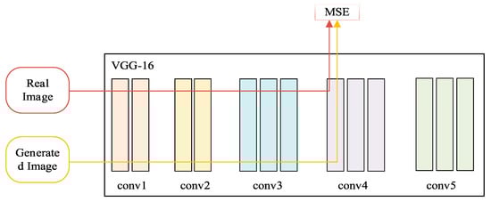 Perceptual loss has the ability of visual perception close to the human eye. Compared with other pixel-level loss functions, it can make the generated image look more realistic and natural. Perceptual loss was originally proposed by Johnson et al. [], and it has achieved good results in multiple application areas, such as image style transfer [], image segmentation [,], image super-resolution reconstruction [,], and image deblurring []. The calculation of the perceptual loss depends on the visual geometric group (VGG) network []. The specific calculation steps are as follows. First, input two images to be tested, namely, a real image and a generated image, into a pretrained VGG network. Then, extract the feature map output by one or several convolutional layers from the VGG network. Finally, calculate the mean square error (MSE) on the feature maps corresponding to the two images to be tested. In this work, the feature map output from the eighth convolution layer in the VGG-16 network was selected to calculate the perceptual loss. The calculation process is shown in Figure 5. The formula is shown in Equation (3).