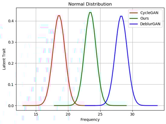 In Figure 8, the results of each model are represented by a Gaussian curve. The mean μ of the curve represents the average deblurring ability of the model, and the variance σ represents the stability of the model. The higher the average value of the curve and the smaller the variance, the better the model. Therefore, it can be seen from the above figure that the model in this paper had better deblurring effect compared to CycleGAN, but it was slightly worse than DeblurGAN.