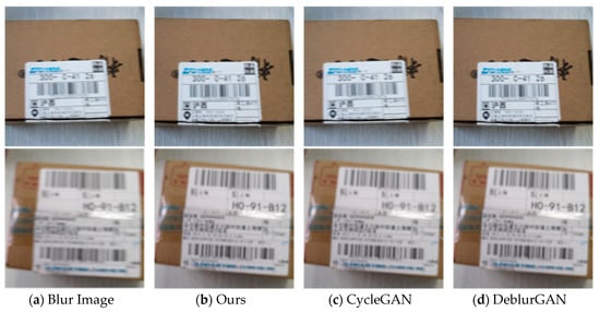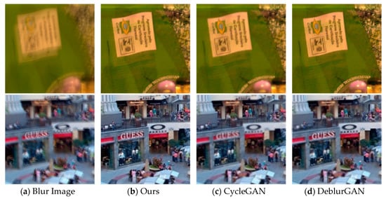 From the results in Figure 9, it can be seen that, compared with CycleGAN, the effect of the proposed model was significantly improved. Not only was the deblurring ability enhanced, but the disadvantages of chromatic aberration, edge distortion, and unnatural sharpness were also eliminated, making the repair. The resulting image looked more real and natural. Compared with DeblurGAN, the method used in this paper obtained similar results on images with low blurring degree, and the images after deblurring were all natural and clear. However, on the images with a high degree of blurring, the deblurring effect of the method used in this paper was not thorough enough, and it was not as good as DeblurGAN.