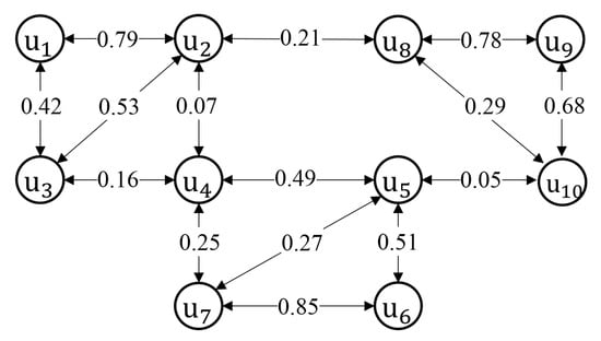 The social graph illustrates the strengths of closeness among people. The strength of social closeness between two people is assumed to be in the range [0,1]. Figure 1 shows an example of a social graph with 10 people . The strength between and equals 0.79, whereas the strength between and equals 0.05. There is no connection link between and . This implies that the strength is 0. The social graph can also be presented as a matrix where the entries are the closeness strengths among the people.