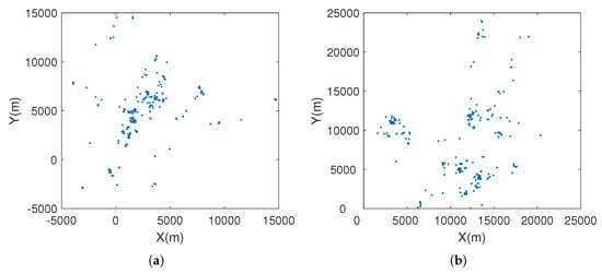 In this section, the simulation area is established to approximate the measurement sites of the New York City trace from Rhee et al. [11]. The area’s size is 24 km× 24 km, and the number of spots, , is 1120. The parameters for generating spots with the BSM are calculated in the same way used by Lee et al. [5].