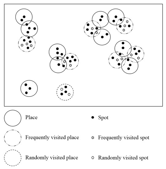In our problem, human movements are reproduced in a considered area. In this area, we assume there is a set of places, , where is the number of places. Each place, , consists of multiple spots. Let the set of spots in the considered area be , where is the number of spots. In other words, place is an area (e.g., mall, park, or hotel) that includes a set of spots. A spot, , is a staying point on the map, such as a clothing store in a mall, or a bench in a park.