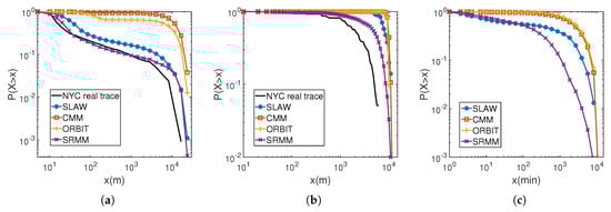 To validate the truncated power-law distribution, the distributions in Figure 6c are also verified with AIC and BIC. The results from AIC and BIC are provided in Table 4. As can be seen in the table, ICT distributions generated by SRMM, SLAW, and CMM fit better to power-law distributions, whereas the ICTs of ORBIT fit better to an exponential distribution. The ICTs of CMM are usually a very long time since people can move to any of the places without periodicity, so the chances of two people meeting again after the first encounter are much lower. In ORBIT, each person randomly chooses a list of places and then randomly picks a place in that list to visit. Thus, two people rarely encounter each other, and the ICTs of ORBIT are also very long times.