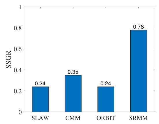 In this subsection, the same social group ratio is obtained to verify that the mobility model can embody social relationships. Figure 11 presents SSGR values from various models. As can be seen in the figure, SSGR from CMM is slightly higher than from SLAW and ORBIT. The best result of SSGR is obtained from SRMM (i.e., 0.78), which indicates that social contexts between people are well embedded into our mobility model.