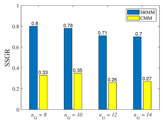 Because the number of social groups () in the area is not considered in SLAW and ORBIT, that does not affect human movements in that models. Therefore, Figure 8 only displays SSGR with different values in CMM and SRMM. In general, SSGR values decrease when increases. People in CMM may visit different places in the network, so increasing leads to a significant decrease in the probability that people will visit the places their social friends are visiting. Therefore, when is a higher value, SSGR from CMM is lower and close to the SSGR values from ORBIT and SLAW. In contrast, in SRMM, people in the same social group have the same frequently visited places and usually encounter each other. Thus, we still obtain a high value of SSGR from SRMM.