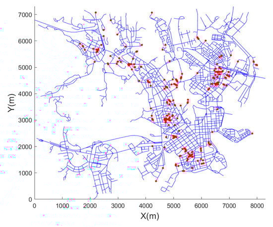 In this simulation, we use the real road map of Helsinki downtown [12]. The size of this map is 8.3 km × 7.31 km and the number of generated spots, , is set to 978. Figure 9 shows generated spots on the real road map of Helsinki downtown.