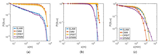 Figure 10c shows the ICT distributions from various mobility models. As shown in the figure, ICTs generated by SRMM are shorter than ICTs from other models since in our model, people in the same social group tend to frequently meet. Please note that the results of AIC and BIC are provided in Table 5. AIC and BIC results indicate that ICT distributions generated by SRMM, SLAW, CMM, and ORBIT fit better to power-law distributions than exponential distributions.