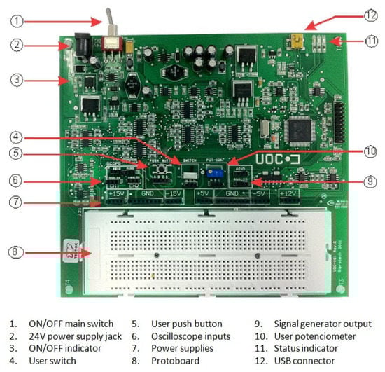 Lab@Home is the assembly and measurement system for electronic circuits developed by UOC, and protected by an utility model, for the learning of electronics concepts in telecommunication engineering degrees [23]. Lab@Home is mainly a hardware platform (Figure 1) connected to a computer that provides the main features of a traditional electronics laboratory at a reduced cost (the current cost for UOC’s students is about $65): circuits assembling, testing, measurement procedures and signal acquisition.