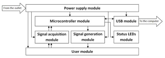 - USB module. It allows the communication between the microcontroller module and the external computer, from which the user can handle, via software, the signal generation and acquisition functionalities provided by the platform.