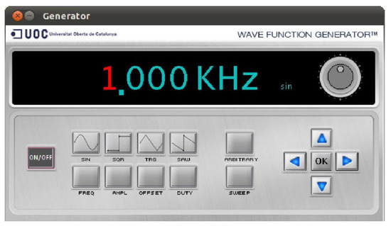 - Signal generation. A periodic function generator (sinusoidal, square, triangular, saw, arbitrary and sweep) is controlled from a PC (Figure 3), with a voltage range of V and a maximum output current of 100 mA. It provides all the typical features (i.e., amplitude, frequency, duty cycle and offset). The maximum sampling rate is 351 kHz (board hardware limitations).