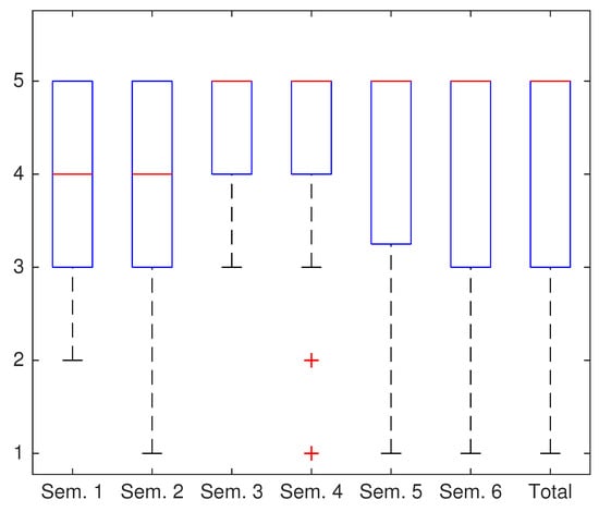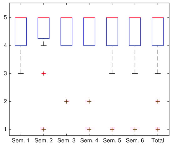Firstly, Q1 question results are presented in Figure 5, showing the boxplots related to the benefits of using Lab@Home in the acquisition of the subjects contents. The most answers obtained a score between 4 (very agree) and 5 (completely agree), with a median value of 5 (completely agree). Therefore, these results show that the most of students thought that the use of Lab@Home had facilitated the understanding of the concepts by means of practical experimentation.