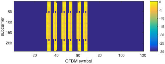 There are five block patterns [10] which have different subcarrier spacings and are applicable for different carrier frequencies: Case A (15 kHz subcarrier spacing), Case B (30 kHz subcarrier spacing), Case C (30 kHz subcarrier spacing), case D (120 kHz subcarrier spacing) and Case E (240 kHz subcarrier spacing). The maximum number of SS blocks in single burst is frequency dependent, and ranges from 4 or 6 in FR1 to up to 64 blocks per burst in FR2. In (Figure 2) an example of SS burst is shown. The SS blocks are clearly visible as yellow blocks. This example will be relevant for the FR1 TDD case reported in Section 3.