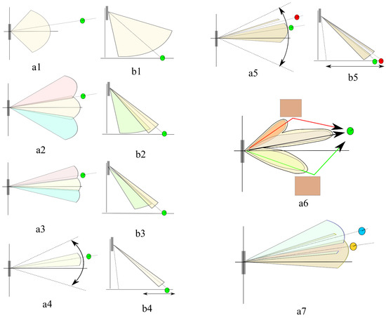 Different antenna technology for Space Division Multiple Access (SDMA) (a1) Fixed beam antenna, horizontal pattern; (b1) Fixed beam antenna, vertical pattern; (a2) switched beam antennas, horizontal pattern; (b2) switched beam antennas, vertical pattern; (a3) switched beam antennas (with different total angular region coverage), horizontal pattern; (b3) switched beam antennas (with different total angular region coverage), vertical pattern; (a4) beam steering antennas, horizontal pattern; (b4) beam steering antennas, vertical pattern; (a5) adaptive antennas with null control (green point: Subscriber; red point: Interference), horizontal pattern; (b5) adaptive antennas with null control (green point: Subscriber; red point: Interference), vertical pattern; (a6) Multiple Input Multiple Output (MIMO) antennas; (a7) Multi-User (MU)-MIMO antennas; blue and yellow points: two receivers.