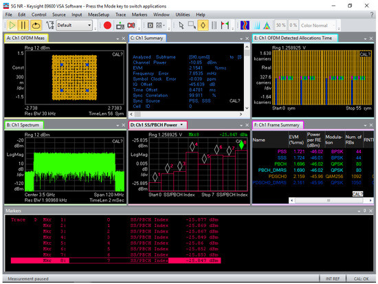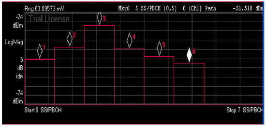 Figure 6 shows that all the SS-Blocks have same power level. This is a consequence of the specific set-up, in which a direct connection by a coaxial cable between the vector signal generator and the analyzer is present, that do not allow to properly model the sweeping/beamforming effect of antennas in real 5G connections. This point will be object of deep investigation in the next subsections.