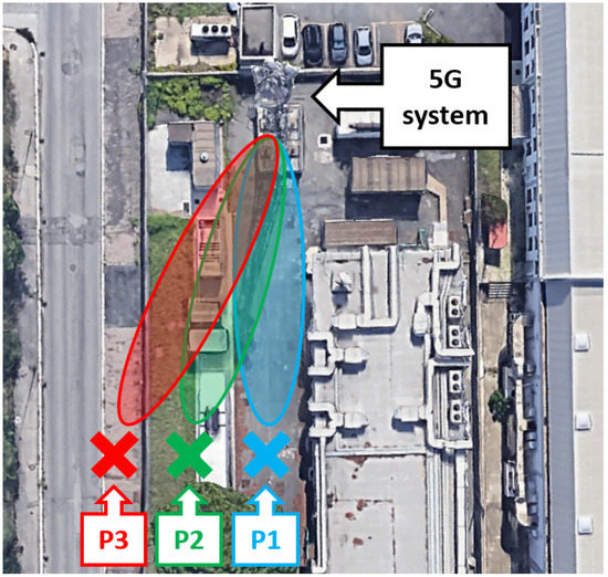 In this Section a OTA (Over The Air) measured signal transmitted by a commercial 5G base station is analyzed. The signal was measured by means of a Vector Netwok Analyzer Keysight MXA N9020A (Keysight) connected to a Rohde & Schwarz HL050 logarithmic antenna using a Sucoflex phase-stable cable. The parameters of the signal are listed in Table 2. The measurement site is shown in Figure 8. Since 5G smartly use both space and time to send information, the data were collected both in the time and the space domain. In particular, three different spatial positions, indicated as P1, P2 and P3 in Figure 8, were selected for the measurements.