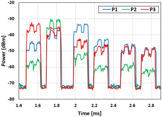 lFR1-TDD signal: SS-Burst power collected in the three measurement positions P1, P2, P3, indicated in Figure 8; the effect of beam sweeping on the detected power level of the SS-Blocks in the SS-Burst is clearly visible.