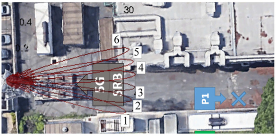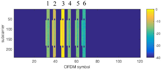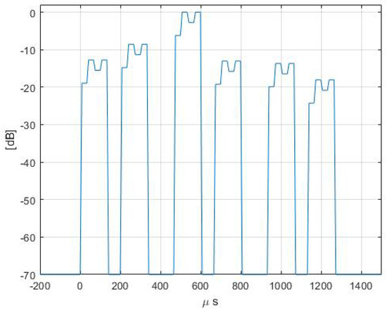 In order to clarify this point, that has important consequences on the development of proper strategies for the estimation of the average field level, a simulation of the P1 position case is shown. P1 position has been selected since no buildings are placed along the propagation path. This allows a basically Line of Sight (LOS) propagation without significant reflection/scattering effects. The set of patterns considered and the position of the receiver are shown in Figure 11. The beam sweeping of the patterns form pattern 1 to pattern 6 modifies the amplitude of the SS Blocks from a constant amplitude, (Figure 2), to a variable amplitude (Figure 12). The subcarrier/OFDM symbol configuration shown in Figure 12 is first mapped into the frequency/time domain and then the signal in the time domain is evaluated. The result is shown in Figure 13. As reader convenience, the measured time-domain signal in the P1 position is plotted in Figure 14, showing a good agreement with the simulation. It must be stressed that the details of the base station antenna were not known, and hence sidelobes could not be accurately modeled, resulting in a slight overestimation of the SS Block amplitude associated to the sidelobes.