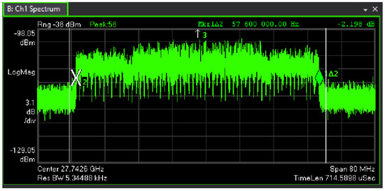 As first case, zero data traffic is considered. The spectrum of the signal in case of zero data traffic is plotted in Figure 15. The figure shows a bandwidth of 58 MHz, given by the 240 subcarriers of the SS Blocks, each of them having kHz bandwidth, indicating a numerology equal to .