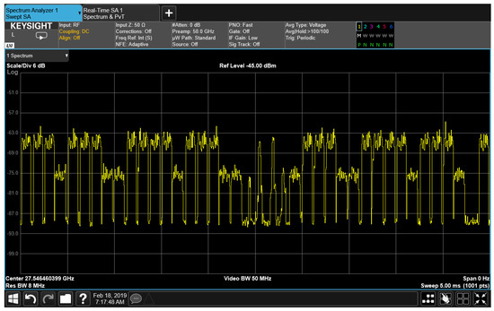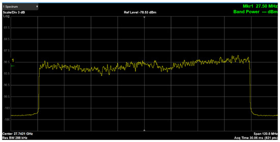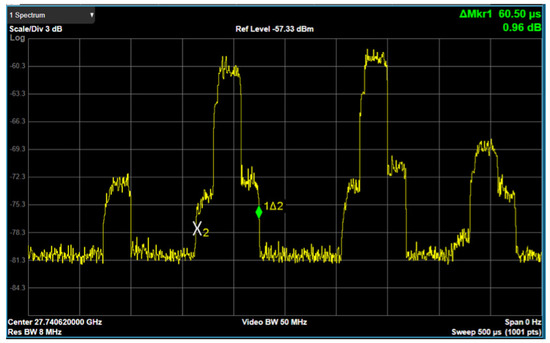 Then, full data traffic scenario was considered. The bandwidth, shown in Figure 17, turns out to be 100 MHz according to the use of all the available subcarriers. Regarding the time-domain behavior of the signal, the zero span measurement is shown in Figure 18. The SS-Blocks can be easily recognized in the central part of the figure. In addition, the measured duration of a traffic slot (about 120 s) indicates a numerology = 3.