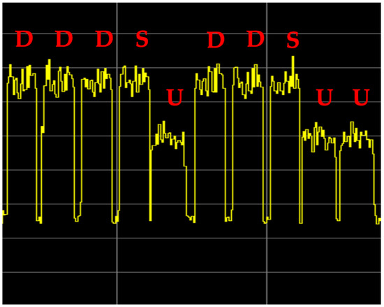 A detail of the signal acquired is represented in Figure 19. The figure is focused on the TDD frame structure, showing ten traffic slots. Note that there are two different detected power levels for traffic slots: The highest one, for type-D (Downlink) and type-S (Special Subframe) [9,10] slots and the lowest one for type-U (Uplink) slots, arranged according to a “D-D-D-S-U-D-D-S-U-U” pattern [10]. The two different detected power levels for traffic slots reflects the difference between the radio base station and the user equipment transmit power.