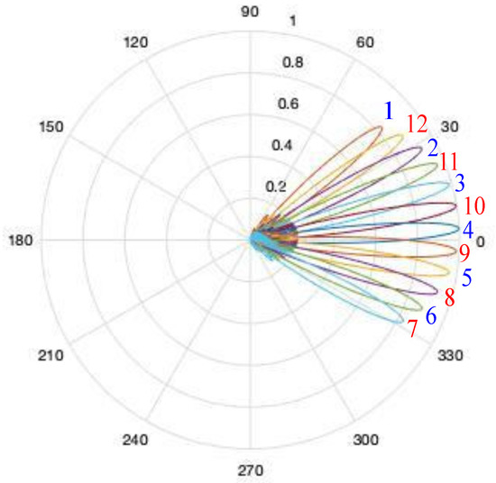 The beam sweeping has been also numerically simulated. In Figure 21 the simulated patterns are shown. The number associated to each of the 12 patterns represents the selection sequence of the patterns. SS-Blocks amplitude have been simulated according to this sweeping strategy. The time domain signal, plotted in the same time scale of the measured signal, is plotted in Figure 22, showing a good agreement with the experimental data.