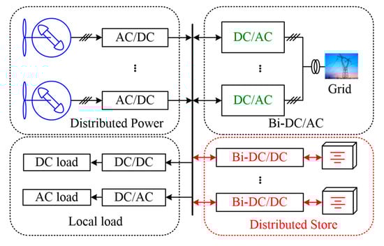 Distributed energy storage is the key issue to solve the issue of grid-connected renewable energy generation. For example, it can improve the ability of the grid to accept wind and photovoltaic (PV) power [1,2,3]. A typical DC microgrid structure is mainly composed of a distributed generation unit, an energy storage unit, a load cell, and a grid-connected converter [4,5,6], as shown in Figure 1. DC microgrid research focuses on stabilizing the DC bus voltage to ensure the power balance of the system. To stabilize bus voltage fluctuations and solve energy supply volatility issues, adding energy storage devices can improve the device’s voltage sag and the inrush issues caused by load-switching, changes in natural conditions, and instantaneous faults in DC microgrid systems; this improves the reliability and scheduling flexibility of the distributed generation grid connection. Using low bandwidth communication control reduces the long-distance stability and DC microgrid distribution of the system due to network delay packet loss and other issues. To avoid the risk caused by long-distance communication control, each unit is divided into three control layers according to the normalized voltage of DC bus and coordinated control of various units [7]. Compared with the two-level converter, the three-level converter has only half of the switches to change state peer cycle, and the voltage stress on the switch is only half of the bus voltage [8,9].