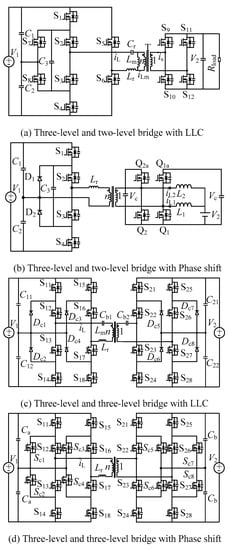 The topology of a series of isolated three-level bidirectional DC/DC converters (TL-BDCs) is shown in Figure 2. In [10], the high-voltage side MOSFETs adopt pulse width and amplitude modulation, and the resonant tank voltage amplitudes [−V1, V1], [−0.5V1, V1], [−0.5V1, 0.5V1], are respectively modulated, as shown in Figure 2a. High gain mode, medium gain mode, and low gain mode are used to meet the requirements of wide range input of energy storage component voltage. In the forward power transmission, the high-voltage side circuit adopts three-level modulation, and the low-voltage side circuit is in an uncontrolled rectification state. When the reverse power is transmitted, the high-voltage side circuit adopts three-level modulation, and the low-voltage side circuit is in a fixed-frequency modulation state. When the topology is pulse width and amplitude modulation (PWAM), some MOSFETs can implement zero voltage switching (ZVS) or zero current switching (ZCS). In [11], the high-voltage side MOSFETs form a three-level structure, and the low-voltage side MOSFETs adopt a buck/boost circuit parallel structure, as shown in Figure 2b. In the traditional pulse width phase shift modulation (PPS), the transformer leakage current control is added, and the peak current and voltage and loss are reduced. All MOSFETs implement ZVS switches. Due to the Direct Current Slew Rate (DCSR) control technology, the transformer loss is significantly reduced, and the overall efficiency is improved. When running in the opposite direction, the three-level half-bridge works in the inverting state. After passing through the transformer, the energy is passed through the two half-bridge circuits with the help of the support capacitor Vc to achieve buck operation. In [12], the phase shift control is adopted in the double active bridge (DAB) with capacitor inductance series resonance (CLLC), as shown in Figure 2c. In bidirectional operation, the active bridge works in the inverter state, and the passive bridge works in the rectified state. Some MOSFETs can realize the ZVS switch and analyze the phase conditions required to realize the ZVS switch. In [13], the bus capacitor voltage equalization control is added on the basis of the three-level DAB circuit, and the parameter design and control scheme are optimized, as shown in Figure 2d.