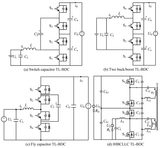 A group of non-isolated TL-BDCs is shown in Figure 4. Reference [14] uses a DC bus capacitor to provide a three-level state (buck/boost synchronous PWM modulation). The dv/dt and the current spike can be reduced by soft switching. In forward power mode, S2, S3, and S4 can realize ZVS turn-on; when reverse power flows, S1 can realize ZVS turn-on. When the integrated capacitive buck/boost converter is integrated with a switched capacitor network and a buck/boost circuit, the voltage gain is 2/D; when the buck/boost circuit is integrated with n-1 switched capacitor networks, the voltage gain is up to n/D. When the converter is running at high gain, the S1 is subjected to large current stress, which exacerbates switching losses. So, it is suitable for low-voltage, low-power energy storage and photovoltaic systems.