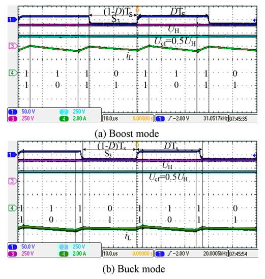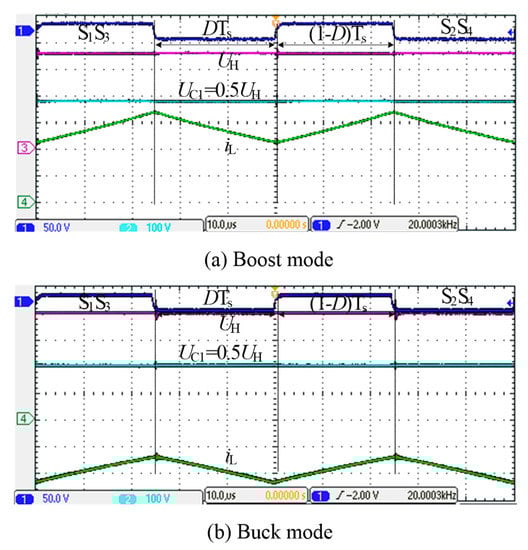 In [15], a two-level buck/boost converter is cascaded to form a three-level bidirectional DC/DC converter. Interleaved PWM modulation is used. S1 and S2 are complementarily turned on, S3 and S4 are complementarily turned on, S2 and S3 are interleaved 180° turned on, S1 and S4 are interlaced 180° turned on, and switches can realize ZVS turn-on. There are three kinds of switching modes when the duty ratio is D < 0.5, three kinds of switching modes when D > 0.5, and only two kinds of switching modes when D = 0.5 (S1 and S4 turn on or S2 and S3 turn on). According to the volt-second balance principle, the converter voltage boost is 1/D, and the voltage stress of the switches in each mode is 1/2 of the high voltage side. However, the modulation method easily causes the duty ratios of the upper and lower half bridges to be inconsistent, thereby affecting the voltage equalization effect of the DC bus and requires an additional voltage equalization control loop at boost mode, which increases the complexity of the control structure.