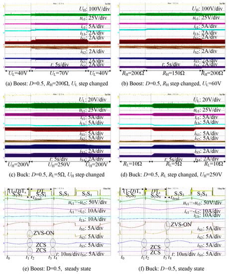 In Figure 7, the integrated CLLC converter can achieve high voltage gain by increasing the CLLC resonant network. Figure 7a–d are a set of tests when the voltage and load are dynamically changed during bidirectional operation, and Figure 7e–f are partial details of the bureau during bidirectional operation. The states of ZVS and ZCS can be observed. For applications with wide voltage variation range, some switches can realize ZVS and ZCS turn-on, and S1 has high current stress.