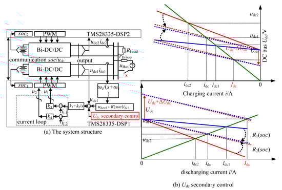 Distributed droop control with low bandwidth communication has high reliability, high redundancy, and meets the demand of distributed generation. Therefore, it has been widely used and tested in recent years [19]. In [20], authors use voltage droop control to obtain the current reference value of each converter based on the reference power divided by voltage, thus achieving power allocation between converters. Average current control is added to the droop control to realize the average load distribution [21]. In [22], the authors consider voltage fluctuations and power-sharing while a converter is removed in the system. Papers [23,24,25] propose droop control power by state of charge (SOC) distribution; thus relating the droop coefficient with the storage module SOC. When discharging the droop coefficient mp, it is proportional to 1/socn. When charging the droop coefficient mp, it is proportional to socn; thus, the larger n, the higher the SOC equilibrium velocity and the lower the average precision. In [26], the equivalent capacity storage unit adopts a two-layer control strategy. The energy storage unit of SOC tends to average Asoc at discharging mode. The droop coefficient kd is proportional to exp[-p(soc-Asoc)] at charging mode, the droop coefficient kd is proportional to exp[p(soc-Asoc)]. Therefore, as p increases, the average speed will increase, and the accuracy of equalization will reduce. Consequently, the estimation accuracy of SOC will impact the accuracy of load distribution. The energy storage unit is mainly connected to the DC microgrid during the control of the second layer. The energy storage unit allocates the output power rationally, according to the SOC information, so that the energy storage unit can reach a consistent state rapidly and accurately. Due to the adoption of low bandwidth communication control, the communication failure conditions must be considered as that will affect the system stability.
