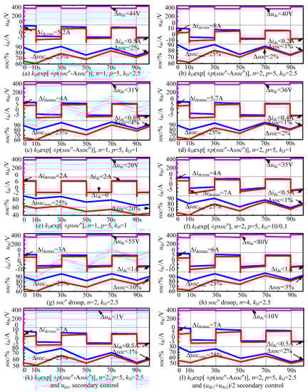 Figure 10e–f, excluding the Asocn terms, suggests a communication loss. After the communication is lost, Figure 10e kD remains the same. When discharging, the R(soc) is very small, and it is too weak to adjust the load of the current. When charging, R(soc) is larger (beyond the allowable range) and turns into the traditional U-I droop control. After the communication is lost, Figure 10f kD is changed according to the charge-discharge mode (kD = 10 at discharging and kD = 0.1 at charging). The systems can still work stably, however, the SOC equilibrating time is longer and the accuracy is lower. As seen in Figure 10g–h, the SOC equalization accuracy and speed can be adjusted by n. However, the SOC equalization accuracy and speed are lower than Figure 10a–d and the DC bus voltage drops further. Droop control leads to voltage drops at the access point, reducing the DC bus voltage quality. To realize rapid and accurate distribution of the load current and compensate a bus voltage drop at the same time, the DC bus voltage is adjusted for a second time and the output characteristic curve is translated to achieve the rated value to enhance the stability of the bus voltage. If the upcc is used as the feedback value at the common point, the DC bus voltage deviation is within 1 V, as shown in Figure 10k.