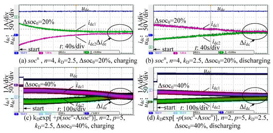 Simulation results of the effect of droop on parameter changes are shown in Figure 10. Figure 10a–d include Asocn, which indicates that the SOC power exponential droop control needs to be created by low bandwidth communications. When n = 1, the average load current sharing rate is slower (Δidcmax = 5.2 A), and the SOC convergence accuracy is lower (Δsoc = 2 ~ 5% at 100 s). When n = 2, the load current sharing rate is faster (Δidcmax = 8 A), and the SOC convergence precision is high (Δsoc = 2% at 70 s and Δsoc = 1% at 100 s). Increasing kD increases the SOC equalization but also increases the DC bus voltage drop.